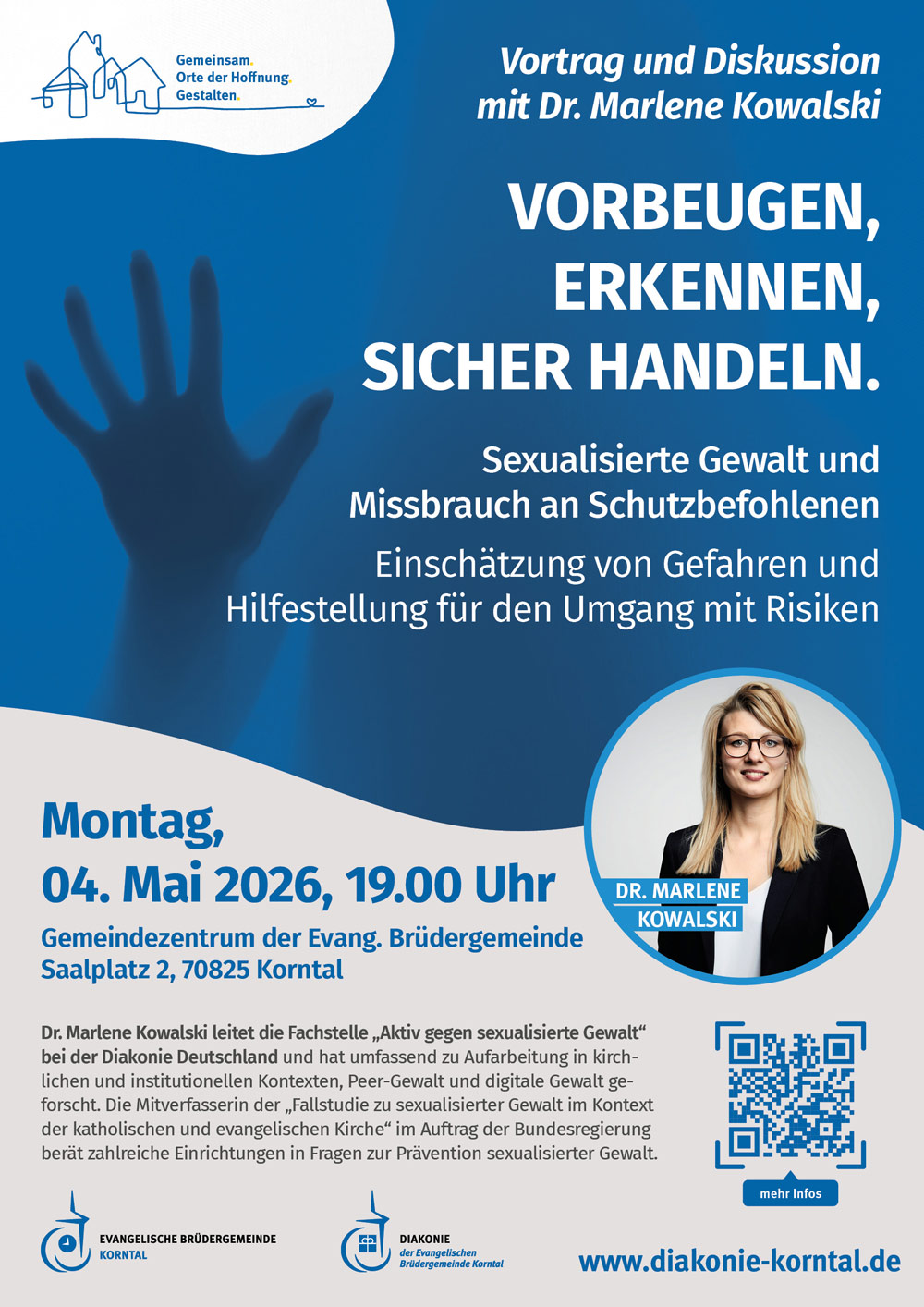 Frau Dr. Marlene Kowalski, Expertin für Prävention und Aufarbeitung von sexualisierter Gewalt und Missbrauch, wird das Thema aus fachlicher Sicht beleuchten und mit den Teilnehmenden diskutieren. Sie zeigt Möglichkeiten auf für die Einschätzung von Gefahren und gibt Hilfestellung für den Umgang mit Risiken.